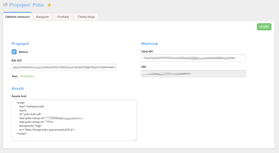 V této části je potřeba vyplnit údaje, které získáte v administraci služby Pobo. Konkrétní hodnoty naleznete v sekci Integrace.