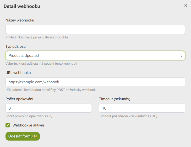 Aby bylo možné přenášet data z Pobo do e-shopového systému, je potřeba nastavit odesílání webhooků přímo v administraci Pobo.