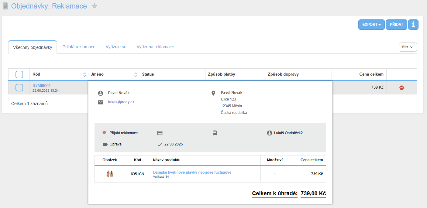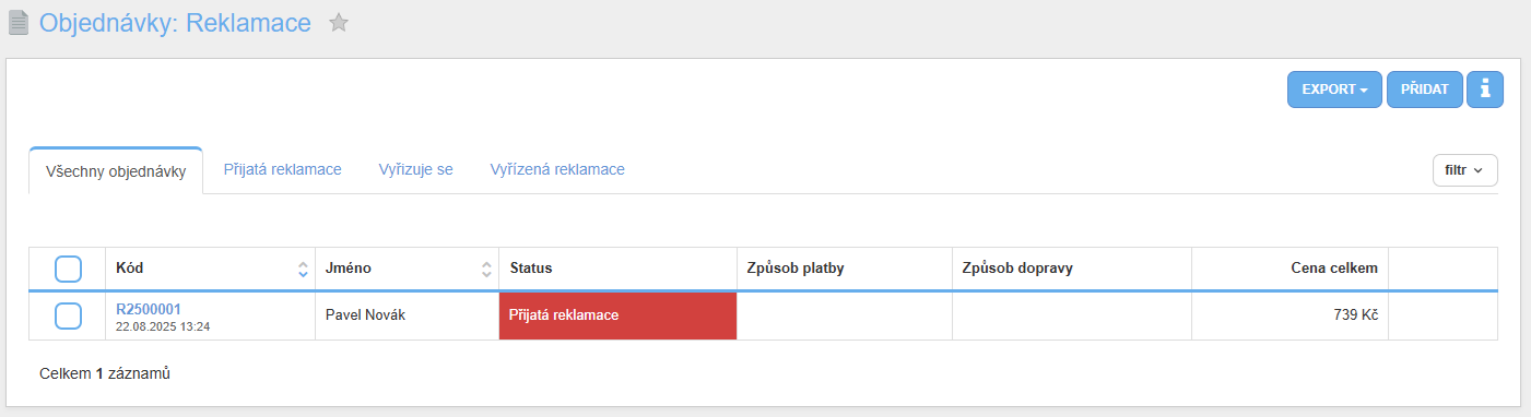 - Ve třetím sloupci vidíte fakturační jméno osoby, na kterou byla reklamace vytvořena.