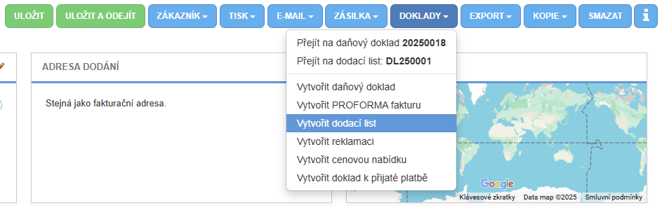 Dodací list musí být vždy spárovaný s objednávkou. Proto je možné ho vytvořit pouze z editace objednávky, použitím funkce Doklady / Vytvořit dodací list. Základní údaje se vyplní podle dané objednávky.